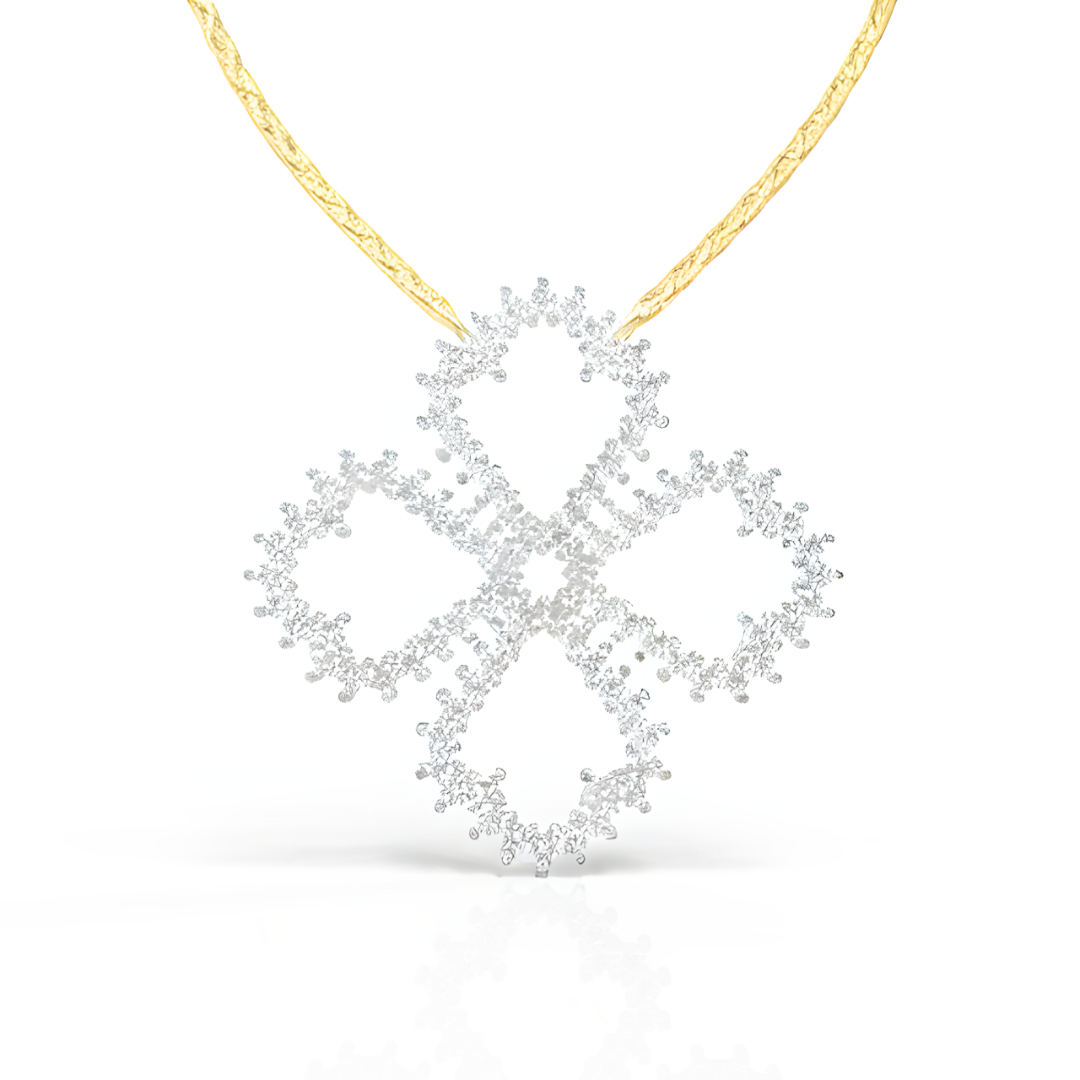 תליון עשוי 18 קראט זהב לבן משובץ ב- 93 יהלומים נוצצים במשקל כולל של 1 קראט. השרשרת באורך 45 ס”מ. מידות התליון 3X3.