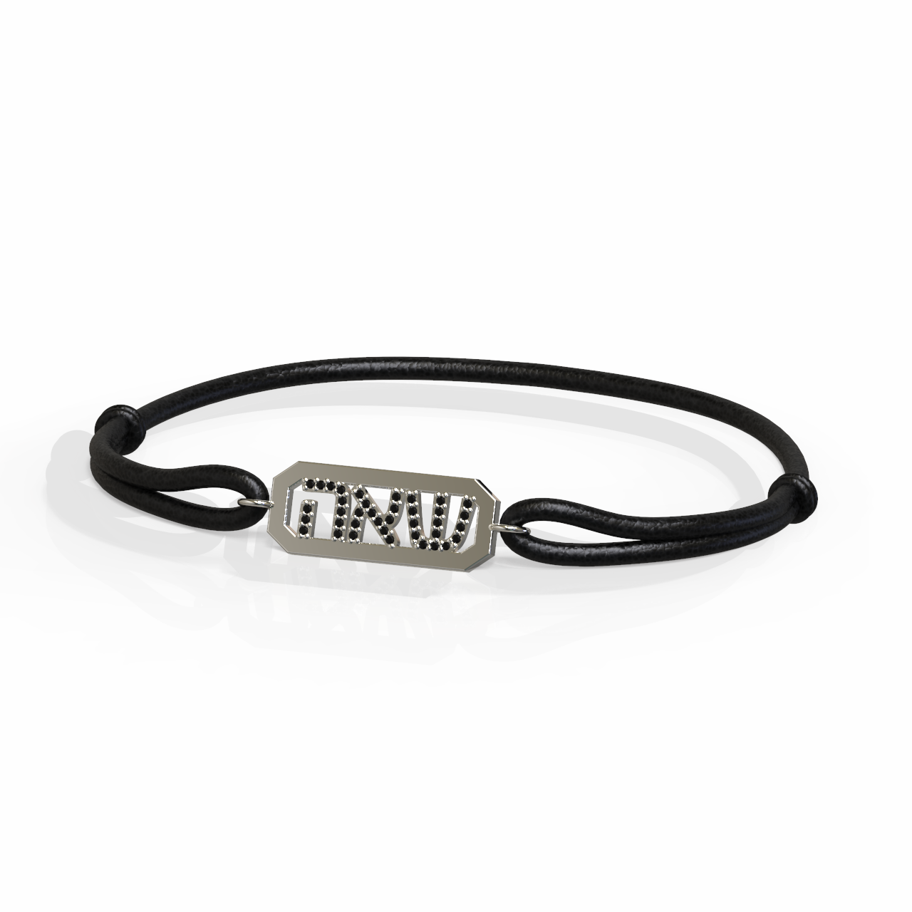 צמיד חוליה עשוי 925 כסף סטרלינג, משובץ ביהלומים שחורים ורצועת עור שחורה. מידות החוליה 120 מ”מ.