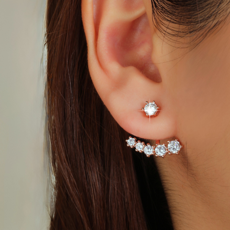 עגילי כסף 925 מצופים בזהב 18 קראט שני מיקרון עובי, ומשובצים בשישה זירקונים בחיתוך עגול.