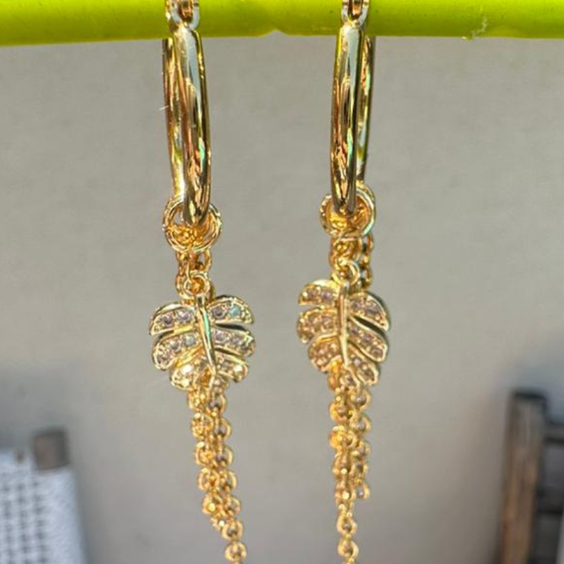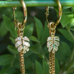 עגילי עלים מוזהבים על שני חישוקים עדינים משטבצים בזירקונים
